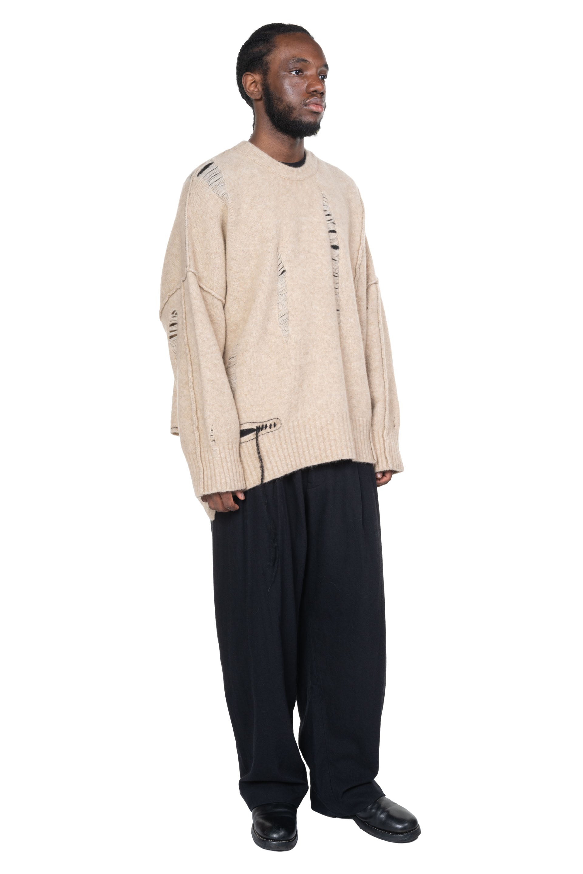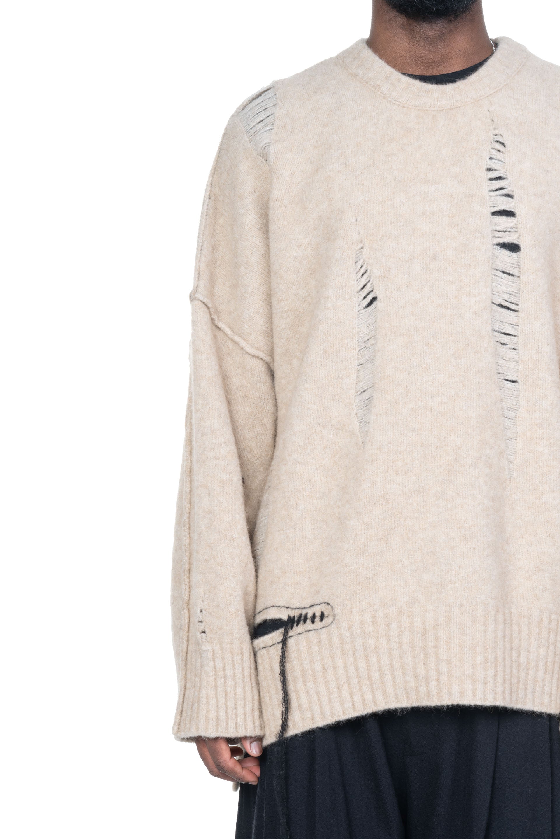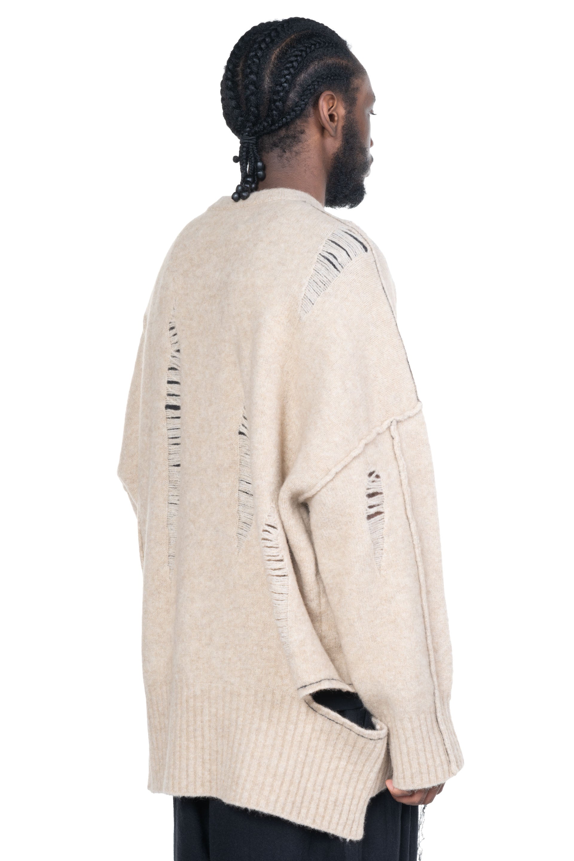 Isabel Benenato is committed to sustainability and makes every effort to minimise its environmental footprint. All of the collection are manufactured in Italy with the intention to save and support her local community. Her design is based on an imperfect perfection that encompasses the human being itself as seen with Yak Crew Neck Cut Out Sweater Natural.