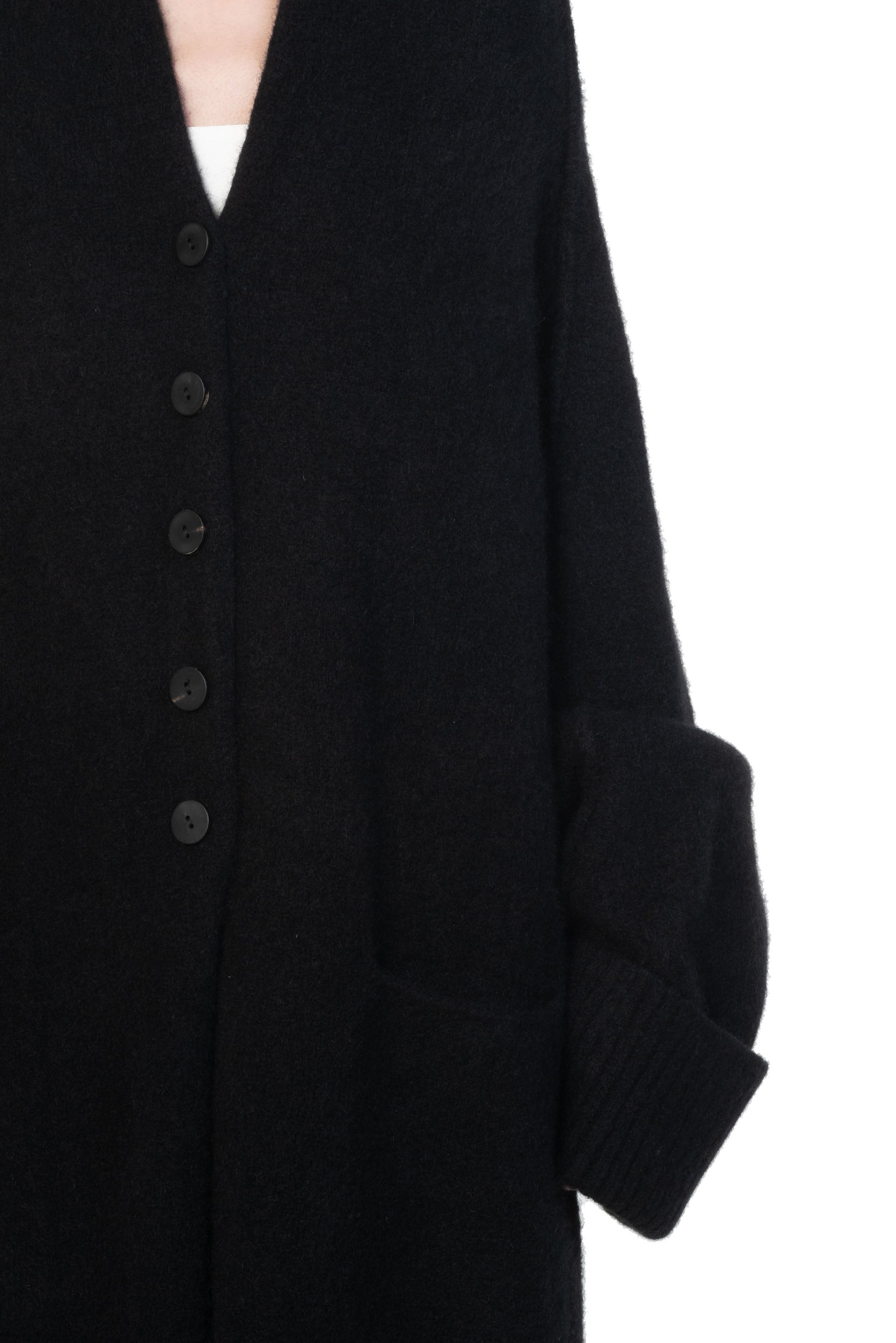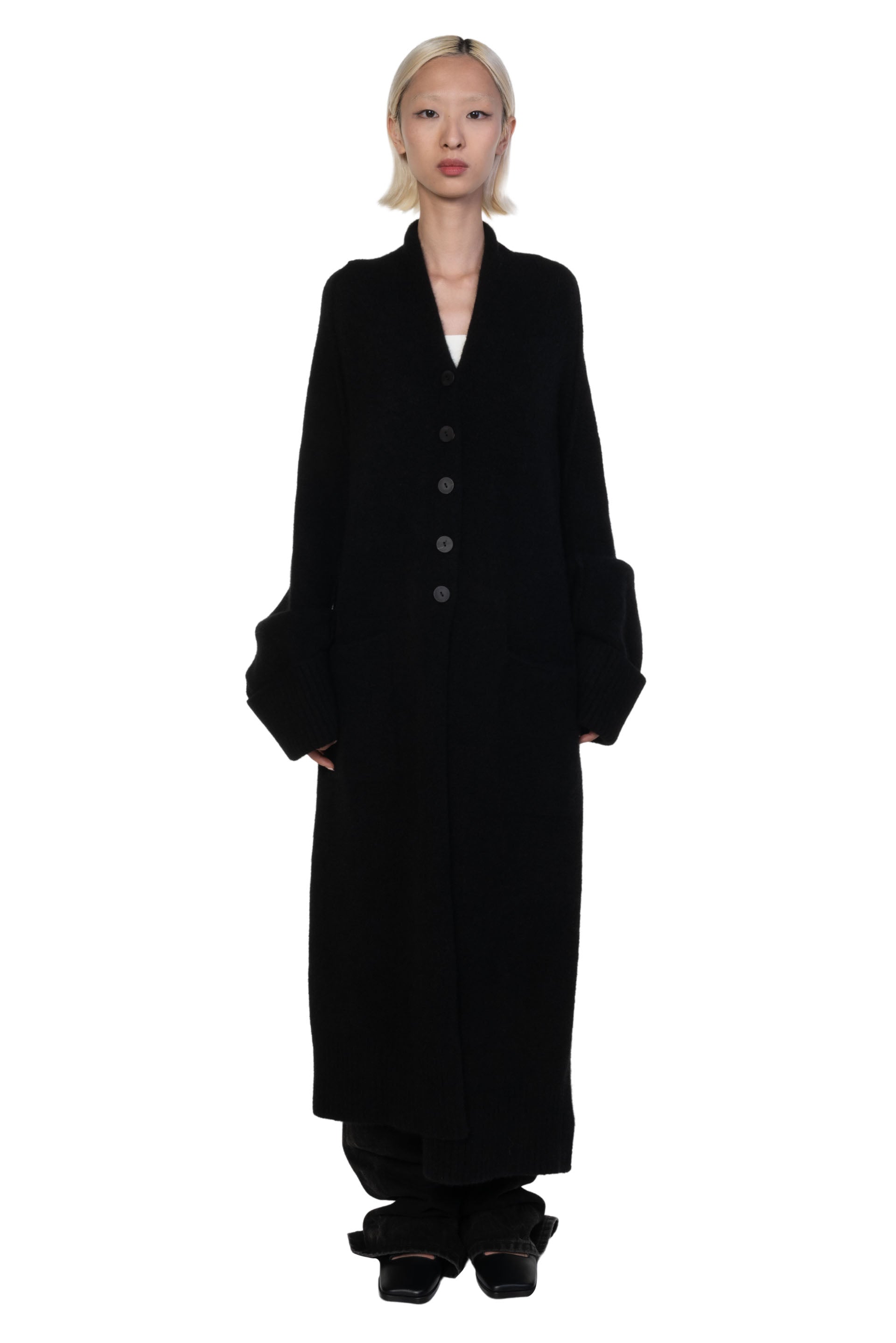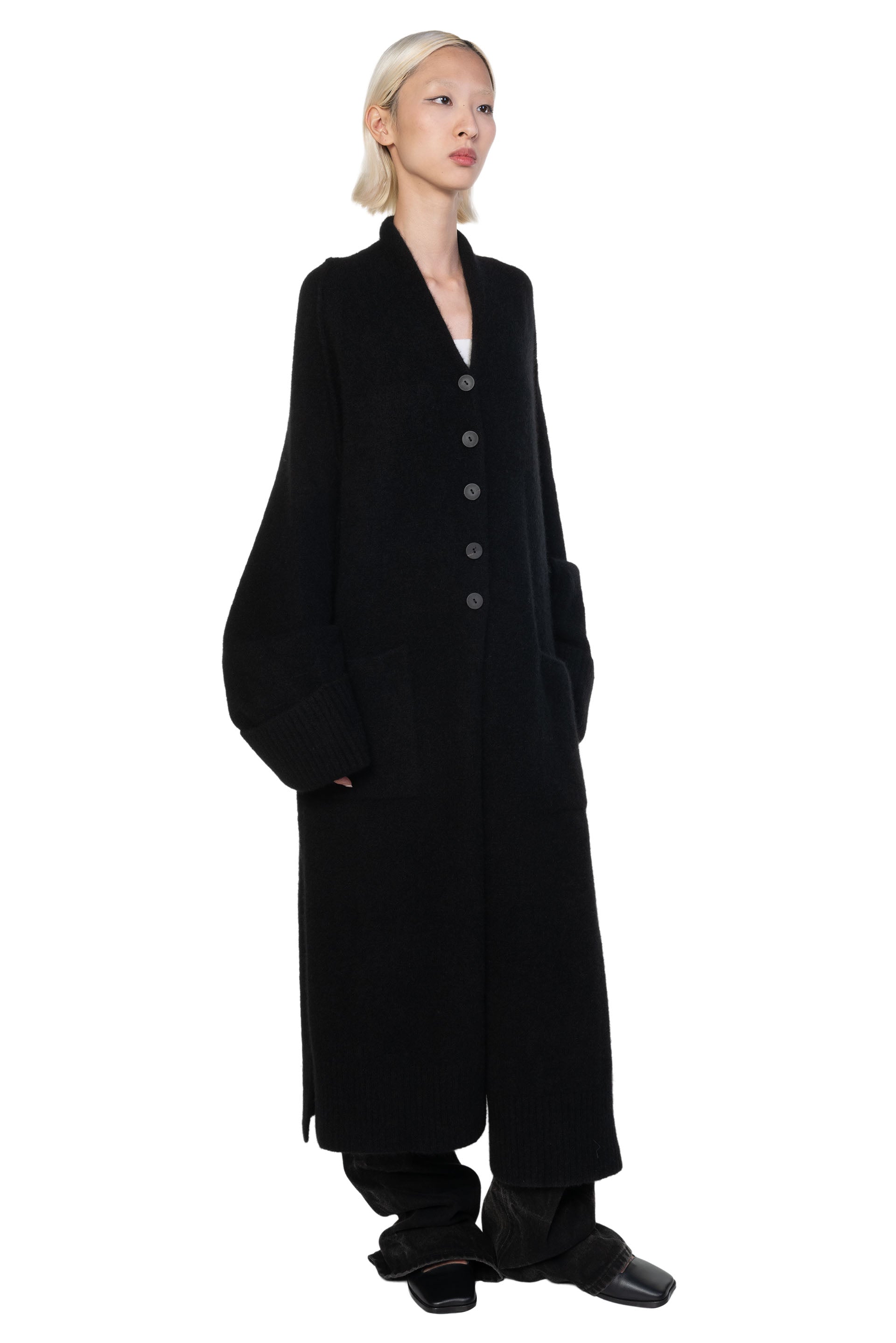 Isabel Benenato is committed to sustainability and makes every effort to minimise its environmental footprint. All of the collection are manufactured in Italy with the intention to save and support her local community. Her design is based on an imperfect perfection that encompasses the human being itself as seen with Yak Long Knit Coat Black.