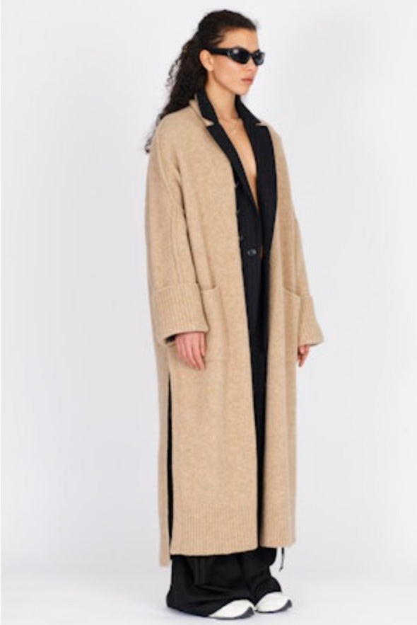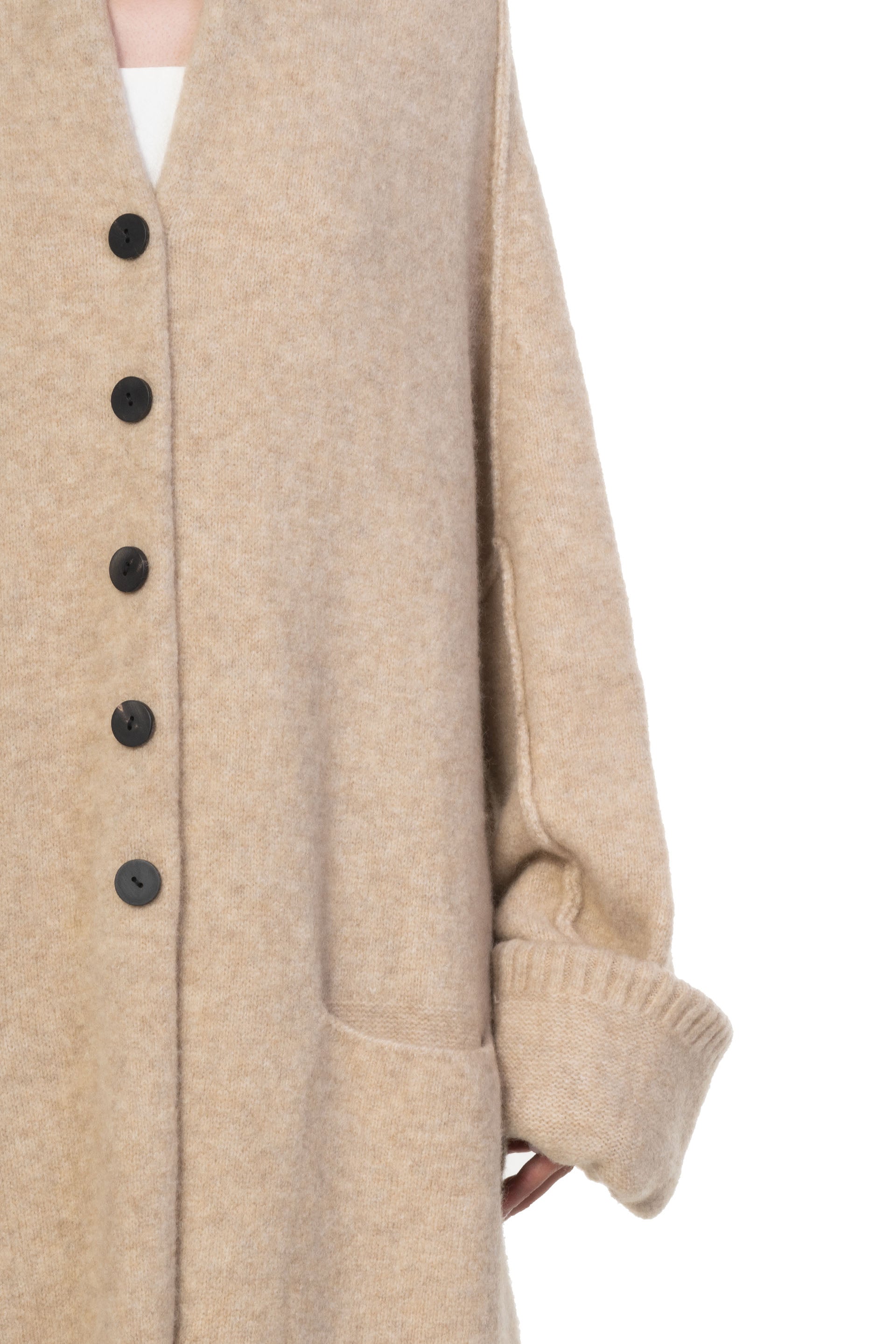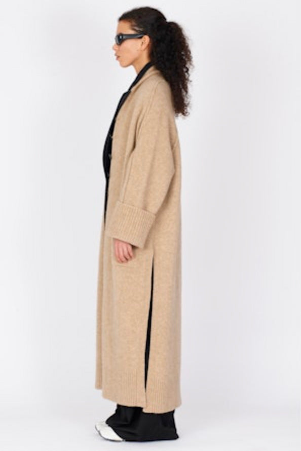 Isabel Benenato is committed to sustainability and makes every effort to minimise its environmental footprint. All of the collection are manufactured in Italy with the intention to save and support her local community. Her design is based on an imperfect perfection that encompasses the human being itself as seen with Yak Long Knit Coat Natural.