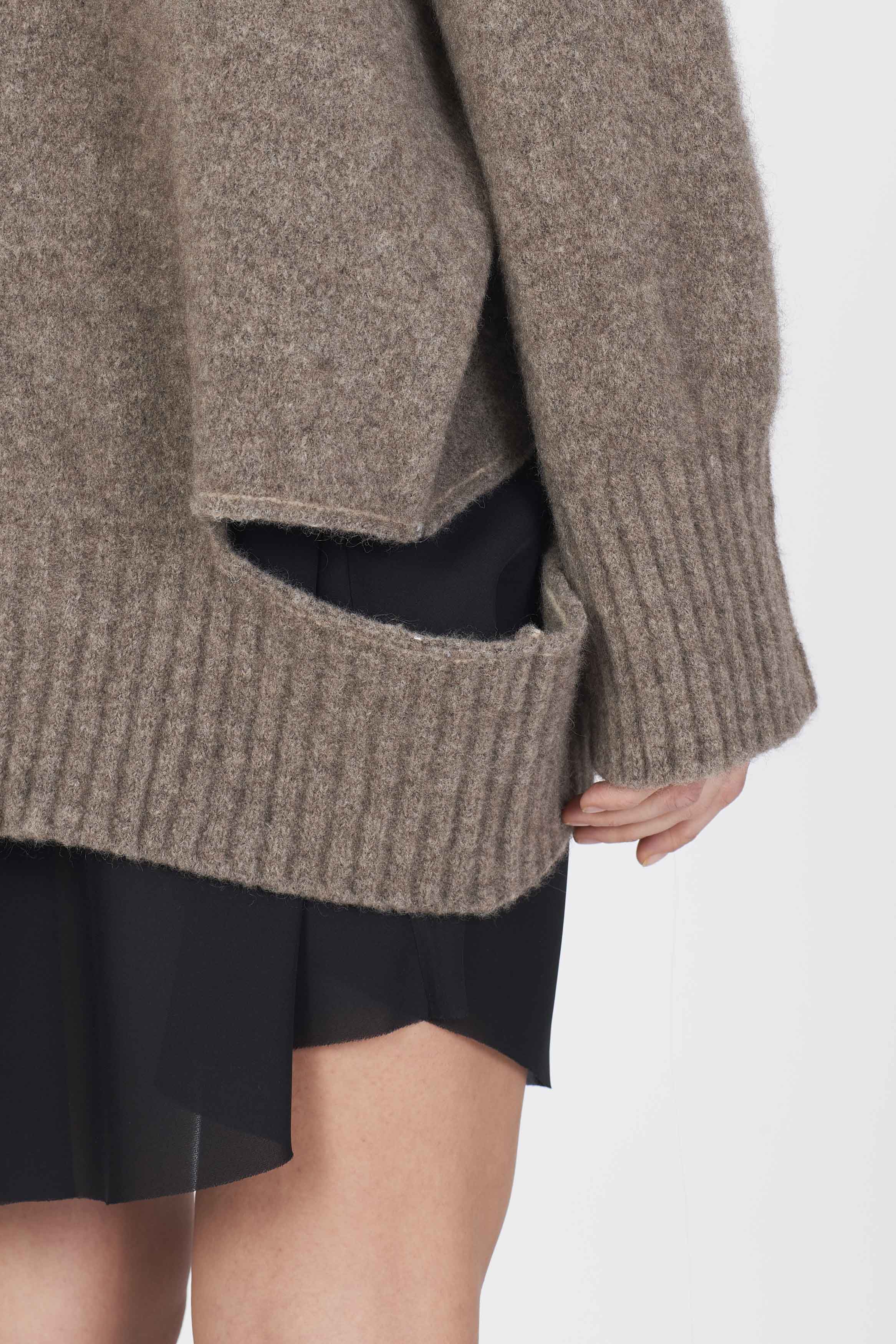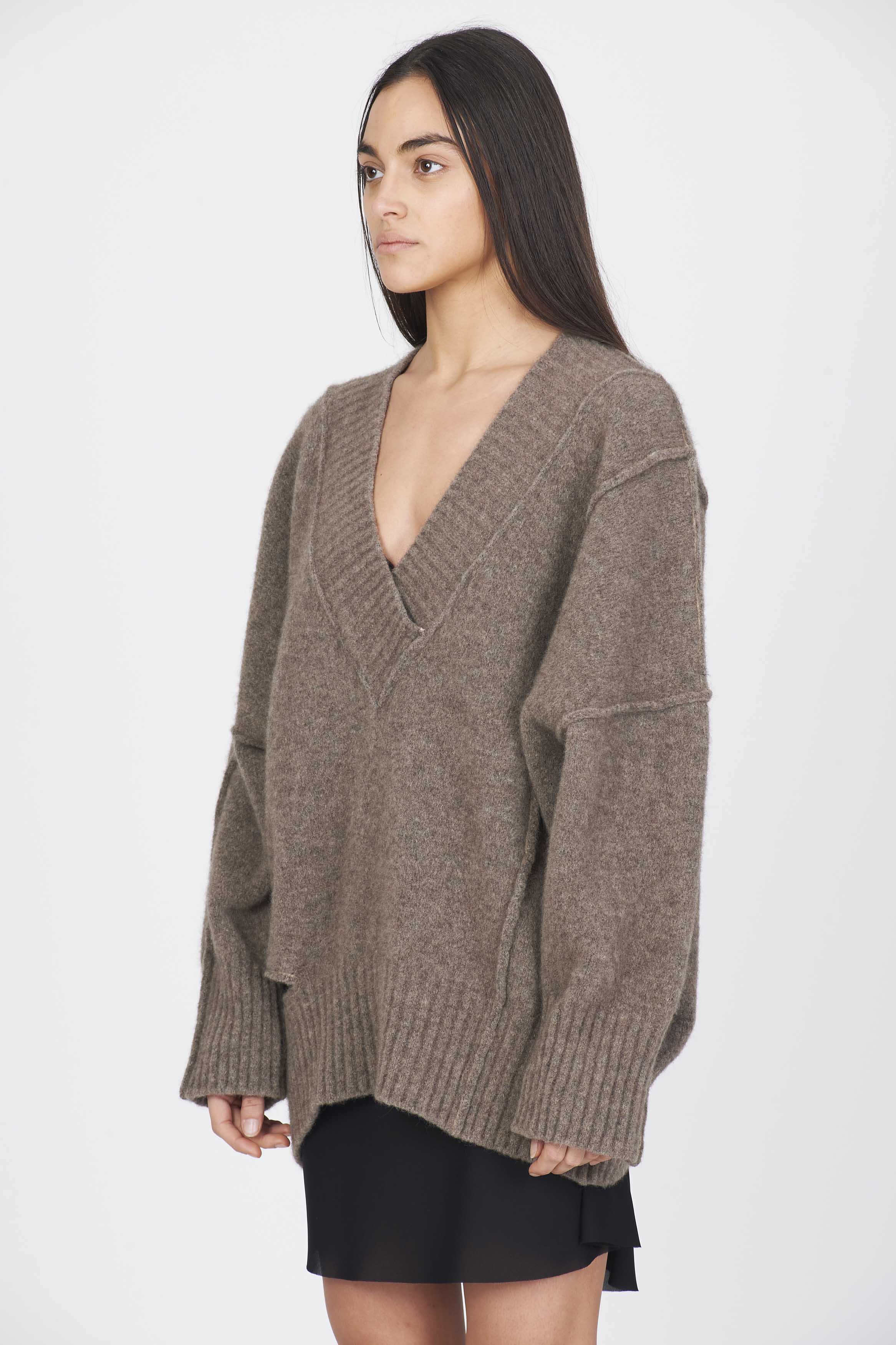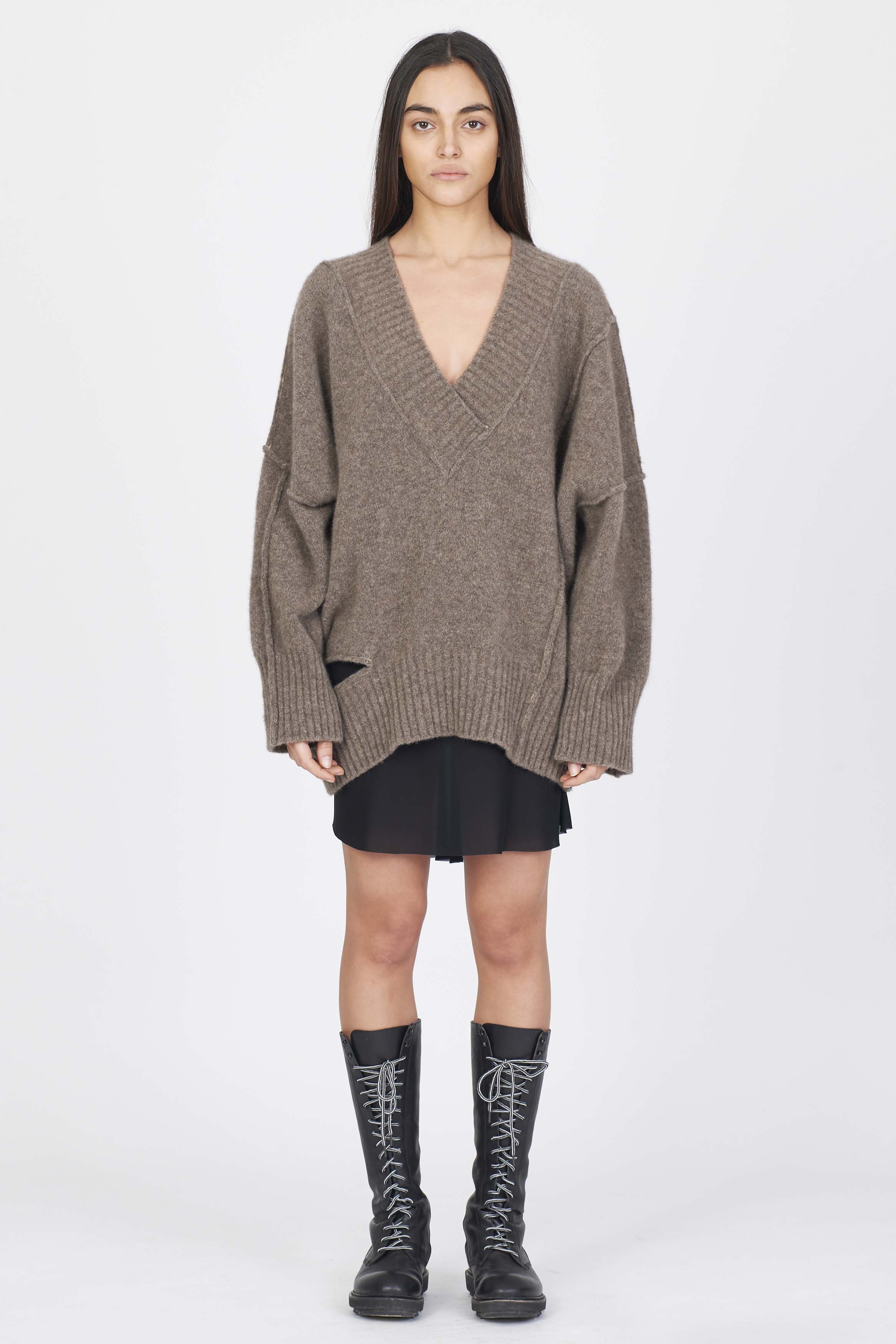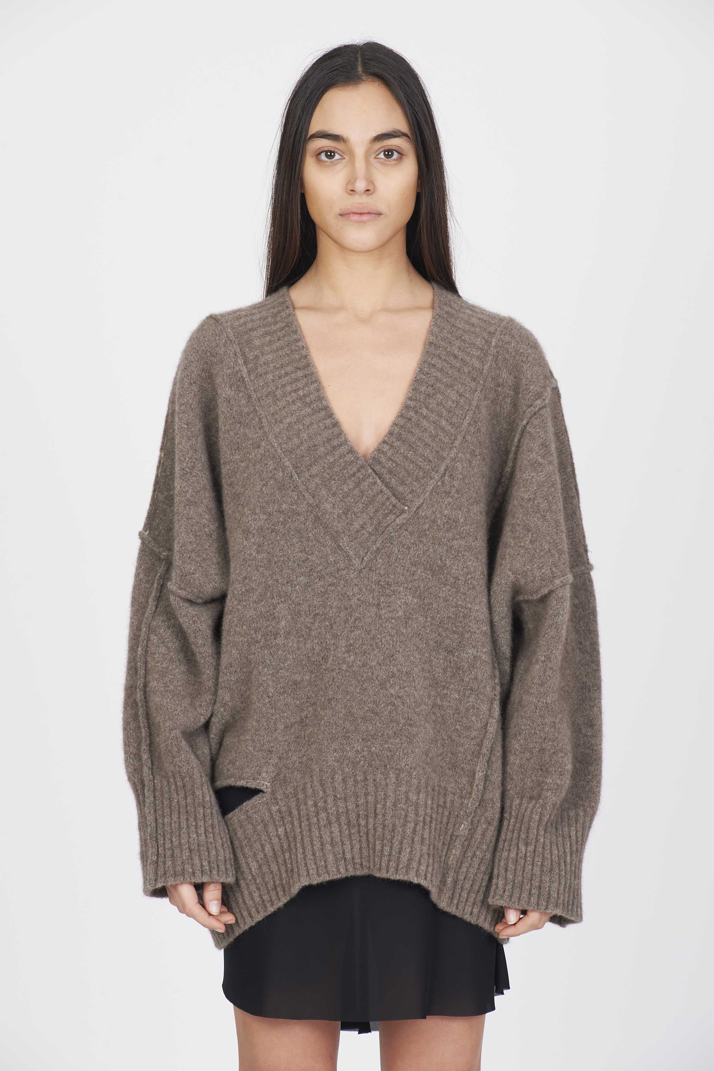 Oversize yak V neck knit. External stitches. Slit details on the edges. Oversize fit.Colour: Taupe. Composition: 54% Wool 22% Yak 19% Nylon 5% Elastane.