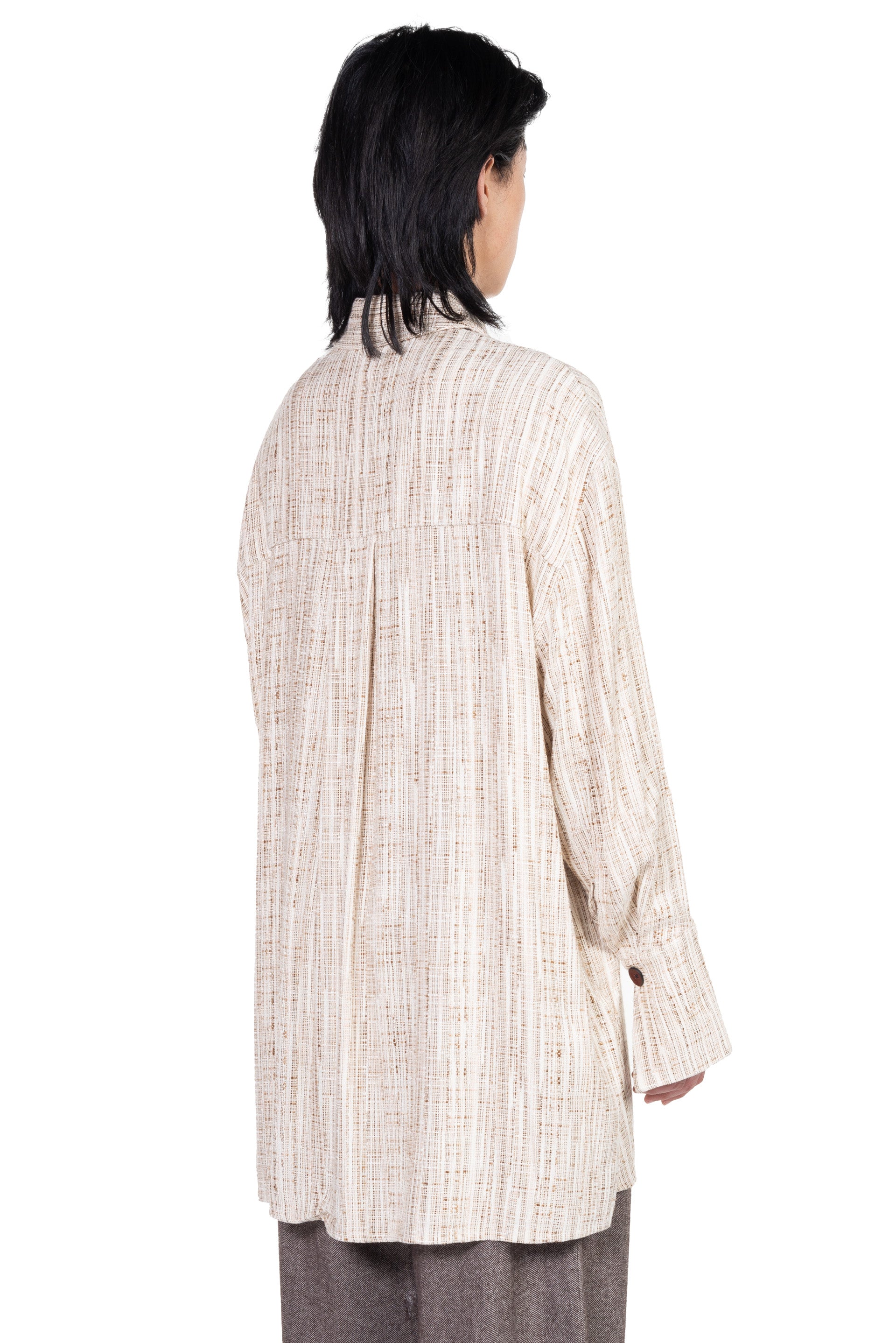 Long sleeves. Button closure at front. Leather buttons. Pleats at back. Beautiful yard dyed fabric. Button at cuffs. Long fit.