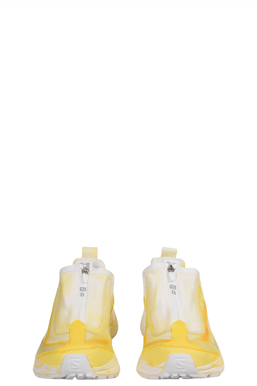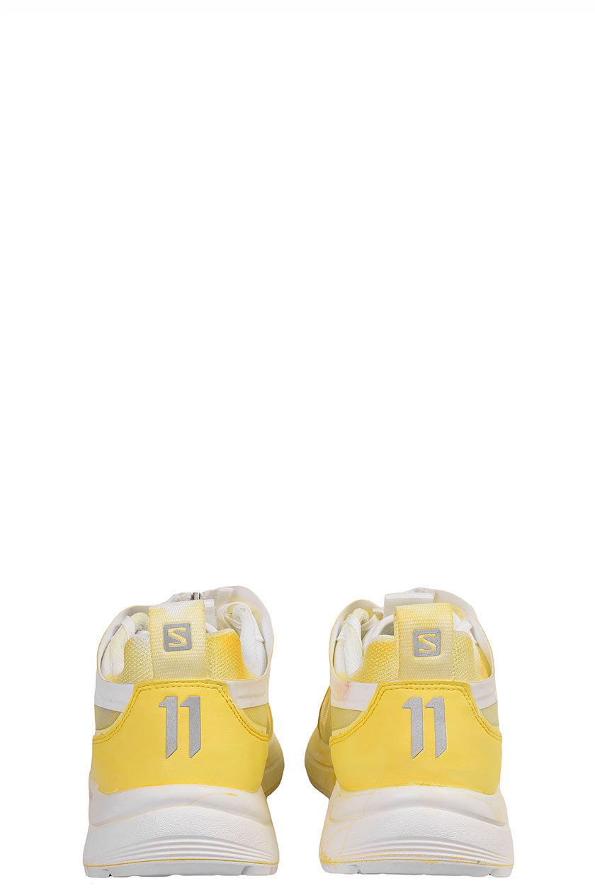 Low-top panelled stretch bonded jersey, mesh, and faux-leather sneakers in Yellow. Over-died detailing and smudging throughout. Round toe. Zip closure in black featuring tonal logo printed at vamp. Tonal concealed lace-up closure. Tonal bonded logo at tongue. Webbing pull loop featuring tonal bonded logo at back collar. Tonal bonded logo at heel counter. Logo and text printed in grey at outer sides. Tonal foam rubber midsole. Tonal treaded Contagrip® rubber outsole.
