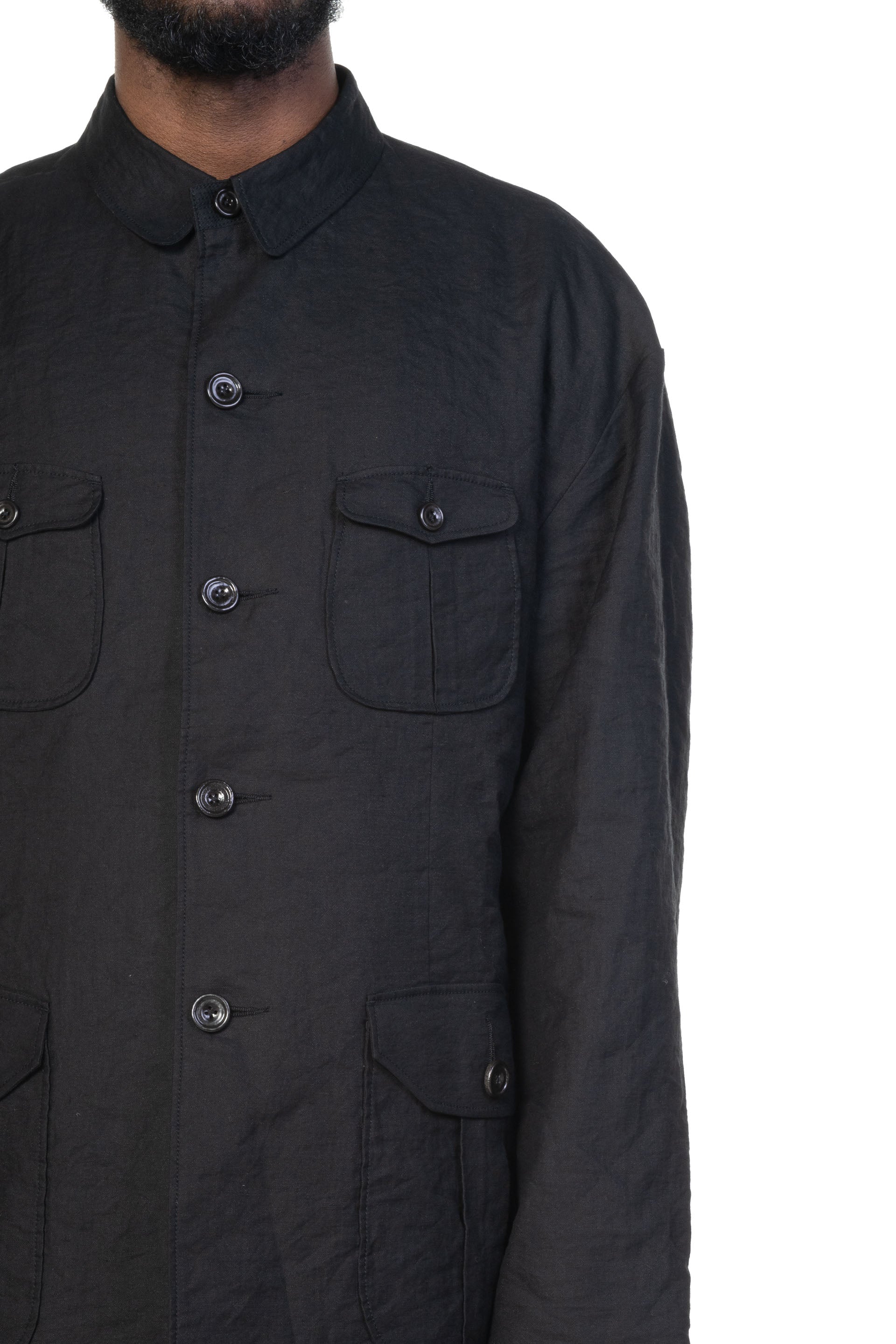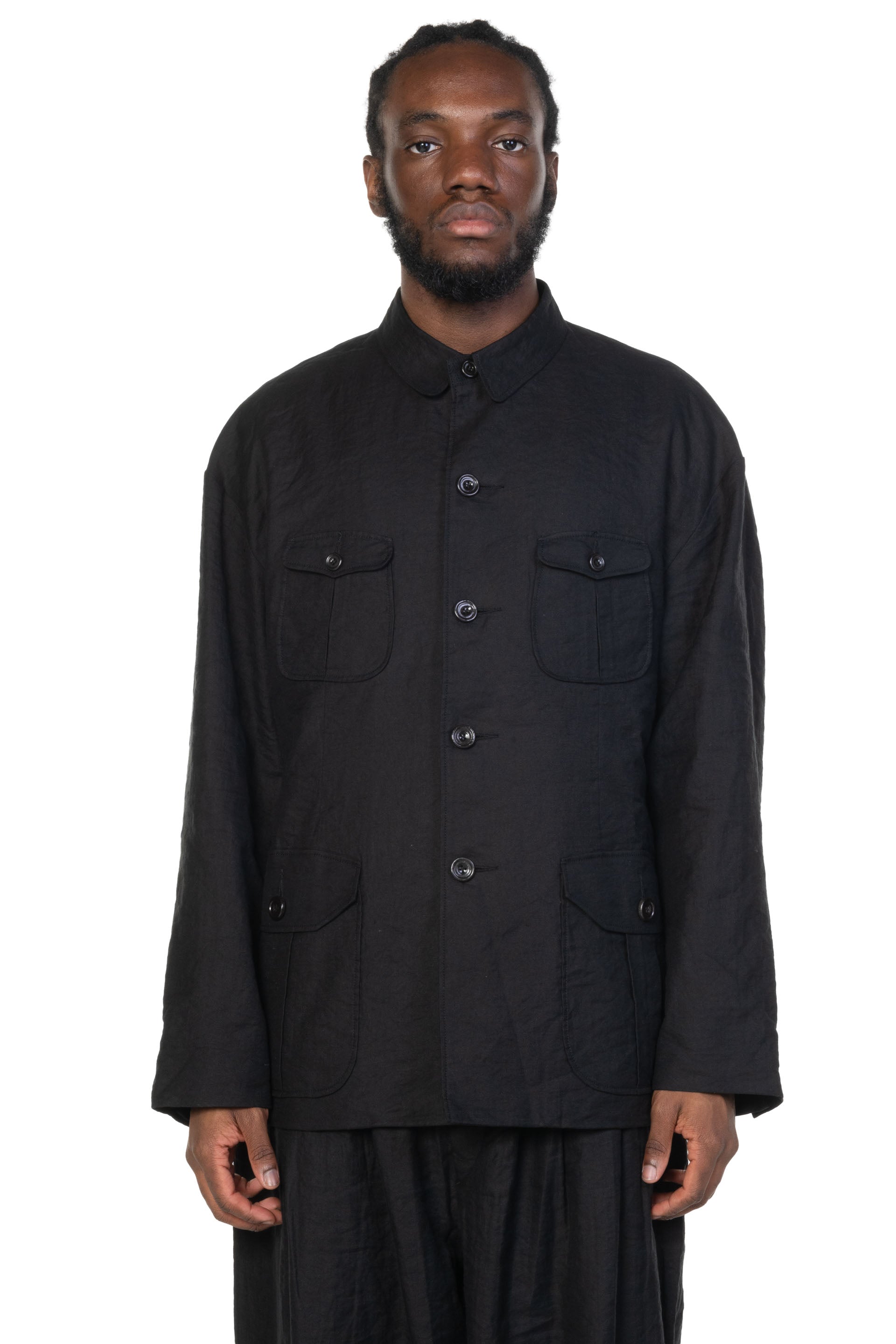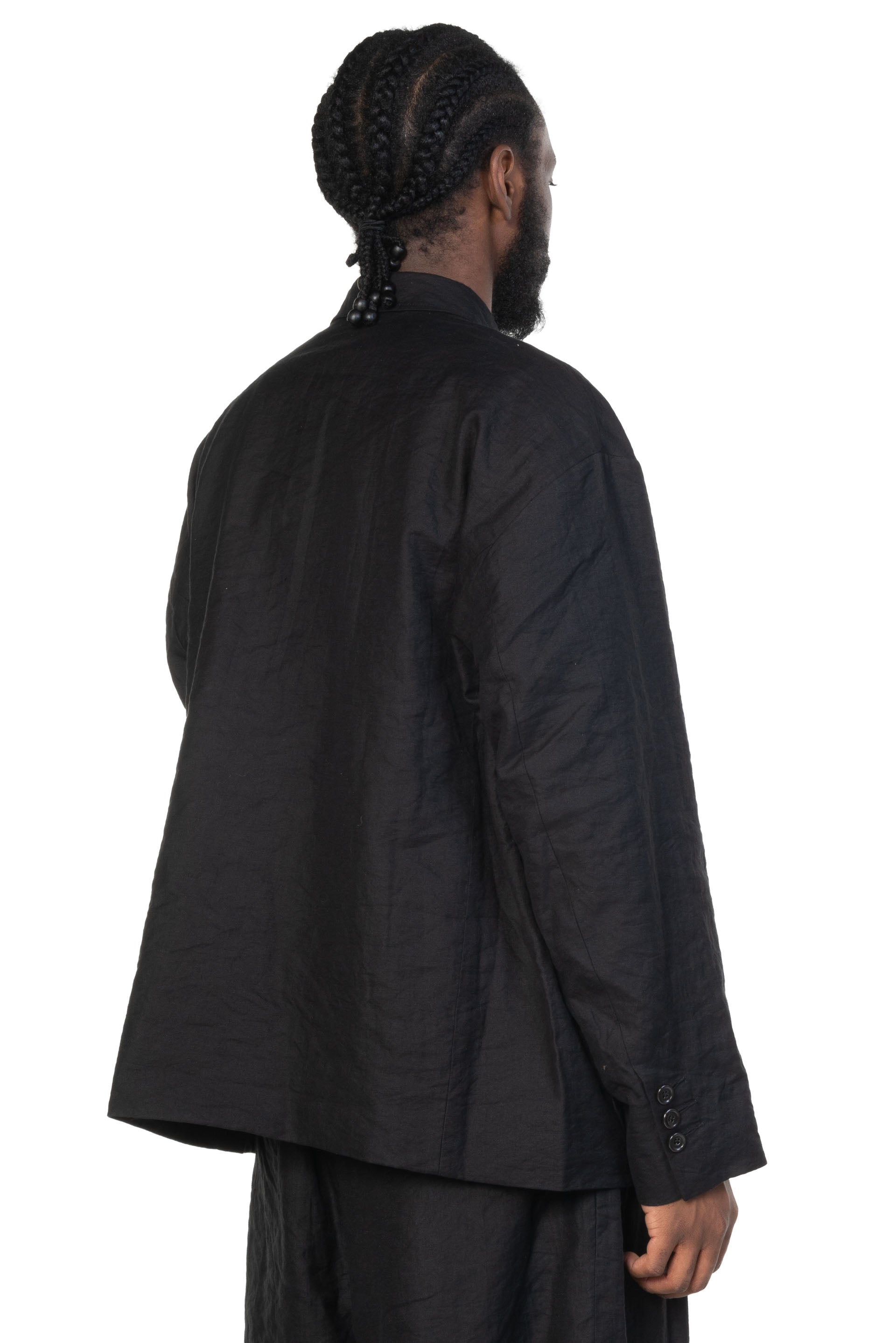 Black Zhongshan Jacket. Long sleeves. Button closure at front. Button at cuffs. Two chest pockets. Fully lined. Two pockets at bottom. Boxy fit. Soft textural fabric.