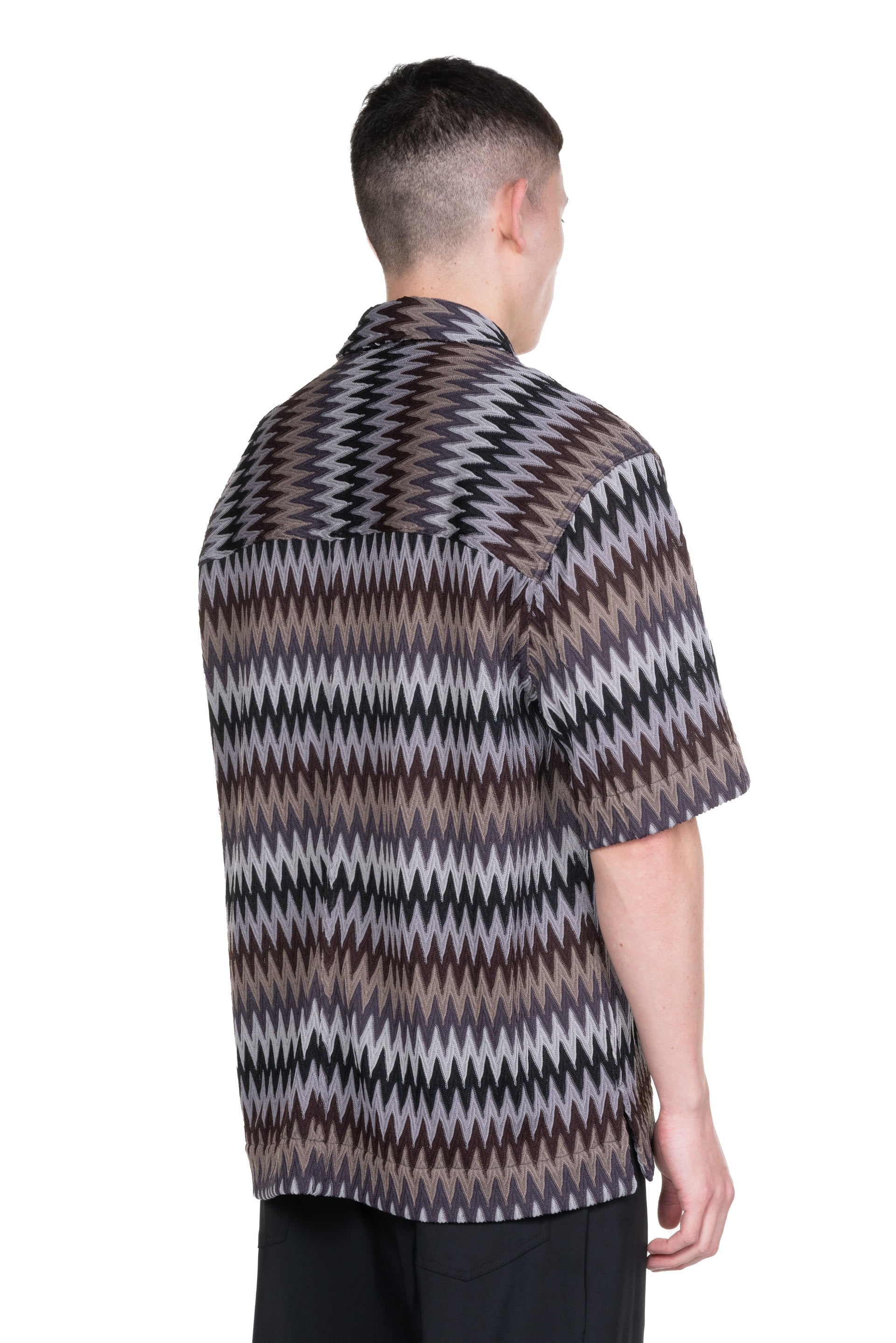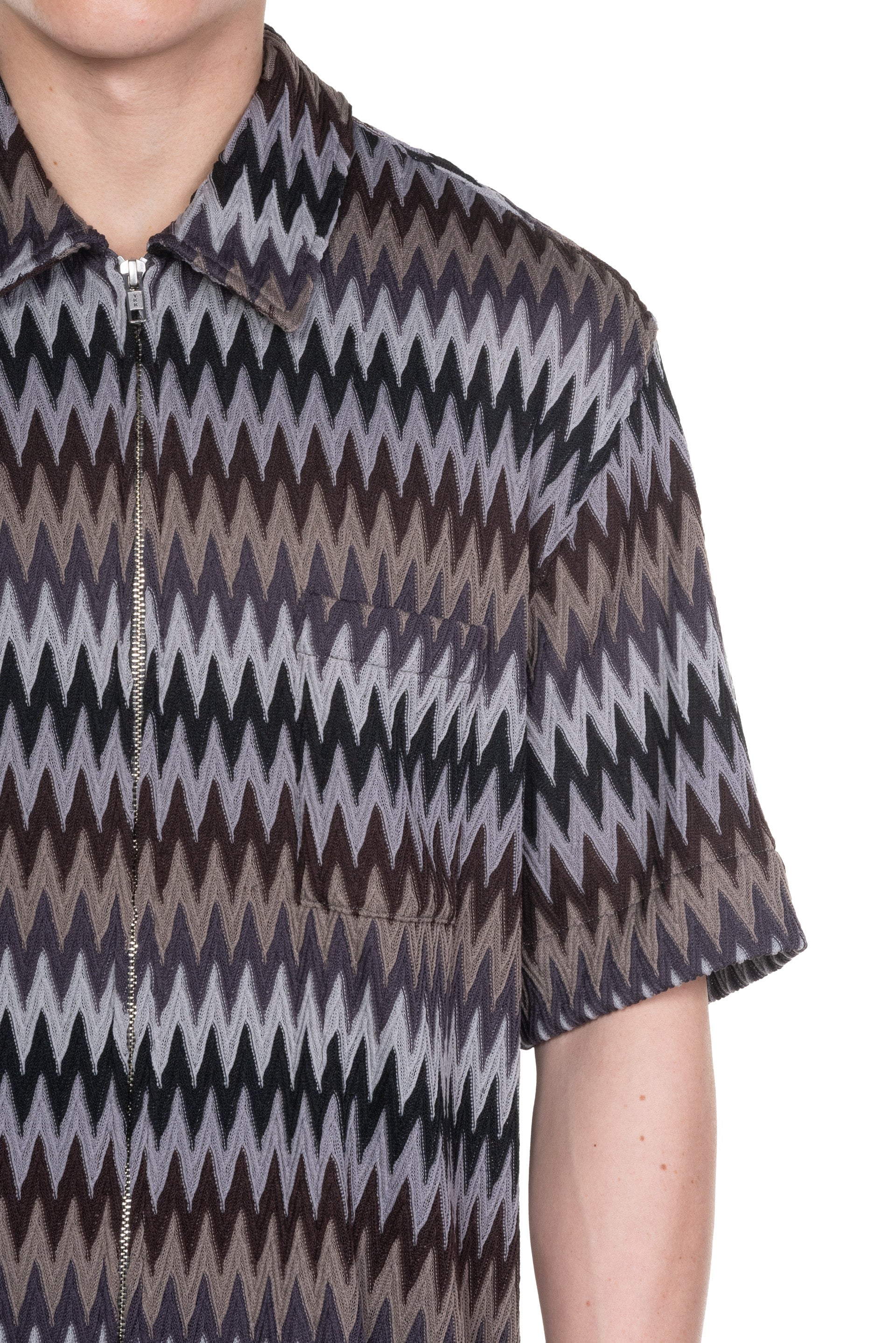 Song for the Mute Oversized fit short sleeve double closure zip up shirt in a zig zag knit. Featuring a two-way zip closure, chest patch pocket and vented side seams.