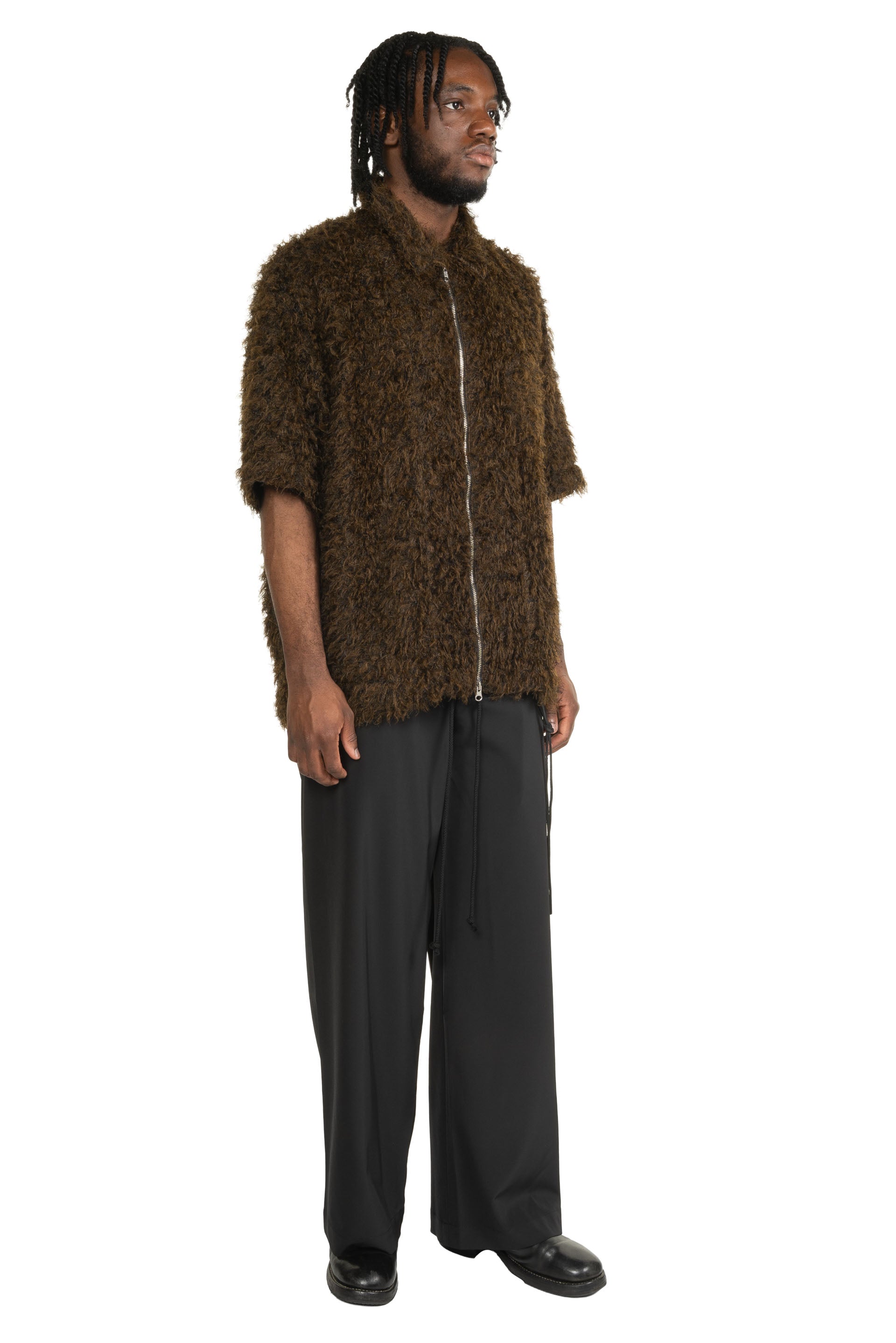 Zip Up Box Shirt Black Brown constructed in a lightweight and soft goat hair wool. Short sleeves. Zip up closure at front.